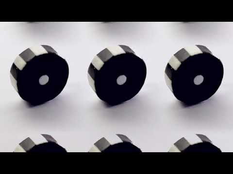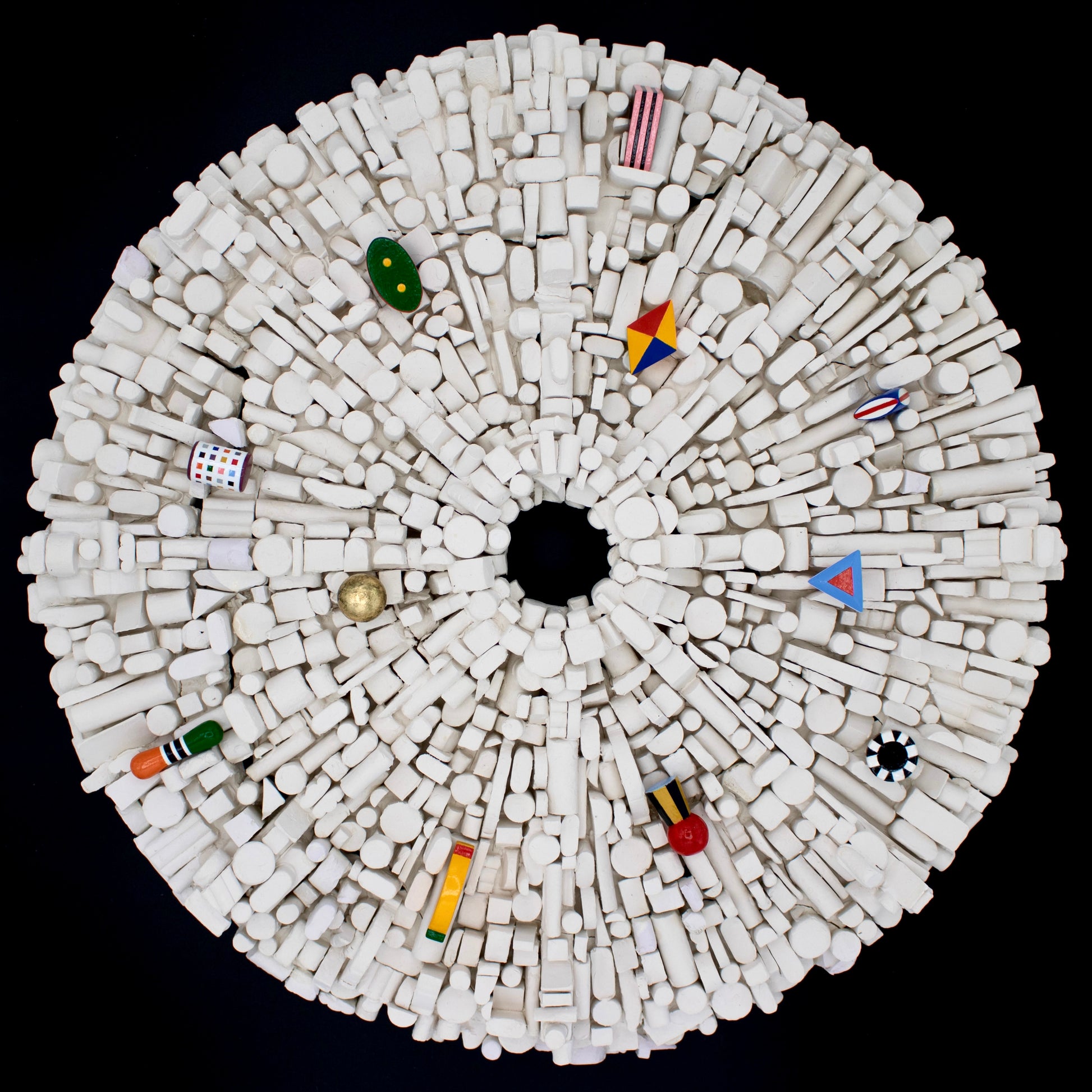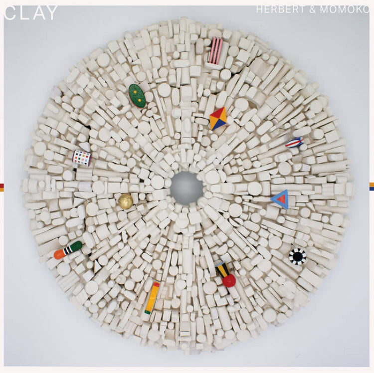 Each track on the album has a corresponding coloured object, all of which could fit in the palm of one’s hand. Pictured on the cover, the eleven small pieces are laid on a ceramic disc, originally intended as a phenakistoscope: underlying patterns and spirals of shape and colour would become visible when spun at optimal speed. After breaking in the kiln, the disc is now pocked with cracks and scars and remains unglazed, testament to plans undone and the trace of forces behind such change.